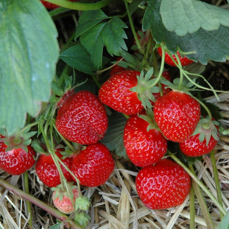 Die Erdbeere Fragaria x ananassa Hummi® ‚Gento‘ trägt zwischen Juni und Oktober saftige, süße und große Früchte in leuchtendem orangerot. Diese Erdbeersorte ist zweimal tragend und verspricht Ihnen eine reiche Ernte. Dabei gehört die Hummi® ‚Gento‘ zu den pflegeleichten, mehrjährigen Hybriden, die problemlos über den harten Winter kommen. Wir empfehlen die Pflege in humosen, durchlässigen und leicht feuchten Böden ohne Staunässe. Ihre Erdbeere bevorzugt sonnige Standorte. Pflanzen Sie die Erdbeeren in einem Abstand von 25 bis 30 cm. Möchten Sie mehrere Beete anlegen, so ist ein Abstand zwischen den Reihen von rund 60 cm einzuhalten. Jäten Sie regelmäßig Unkraut und mulchen Sie die Beeren mit Stroh, um dem Grauschimmel vorzubeugen.