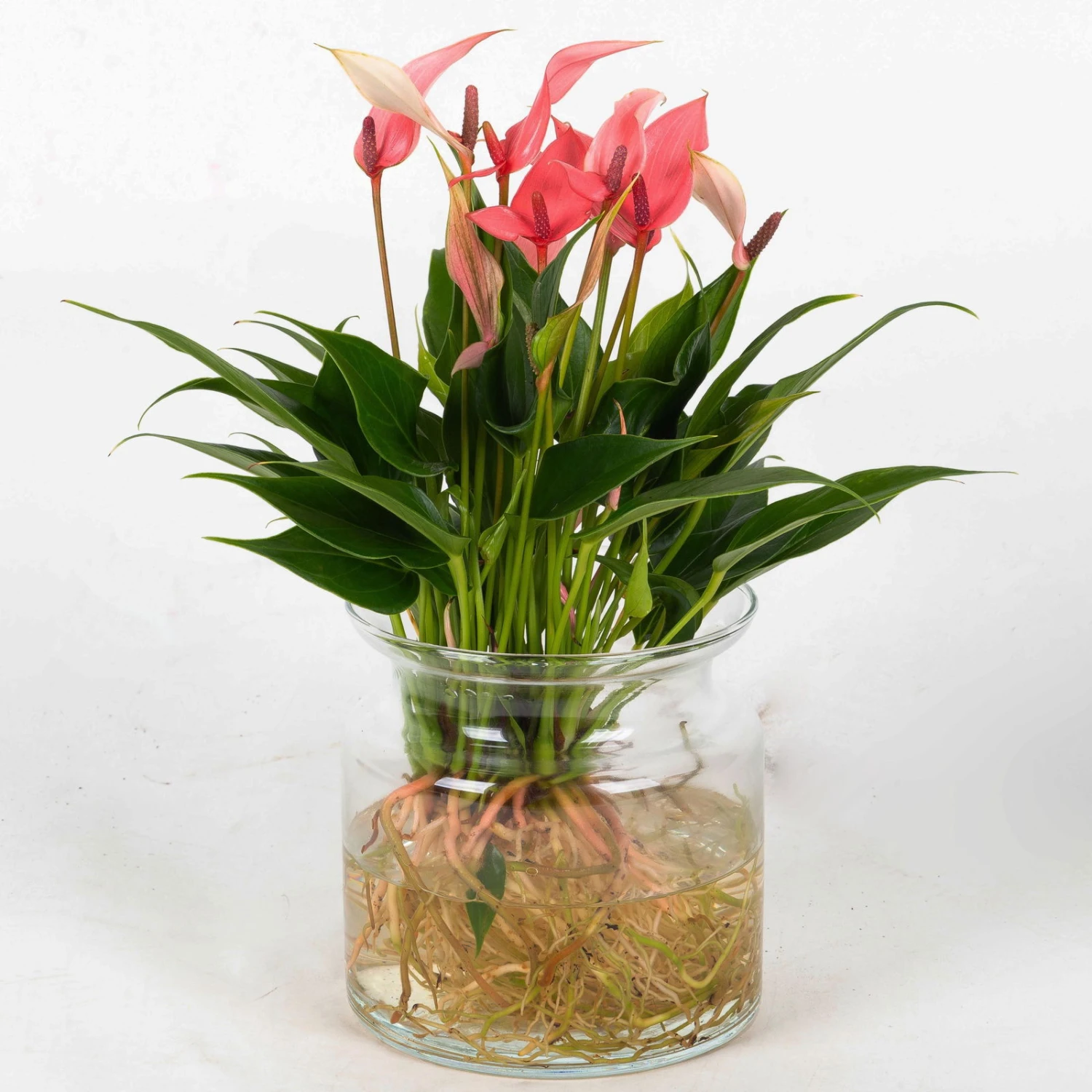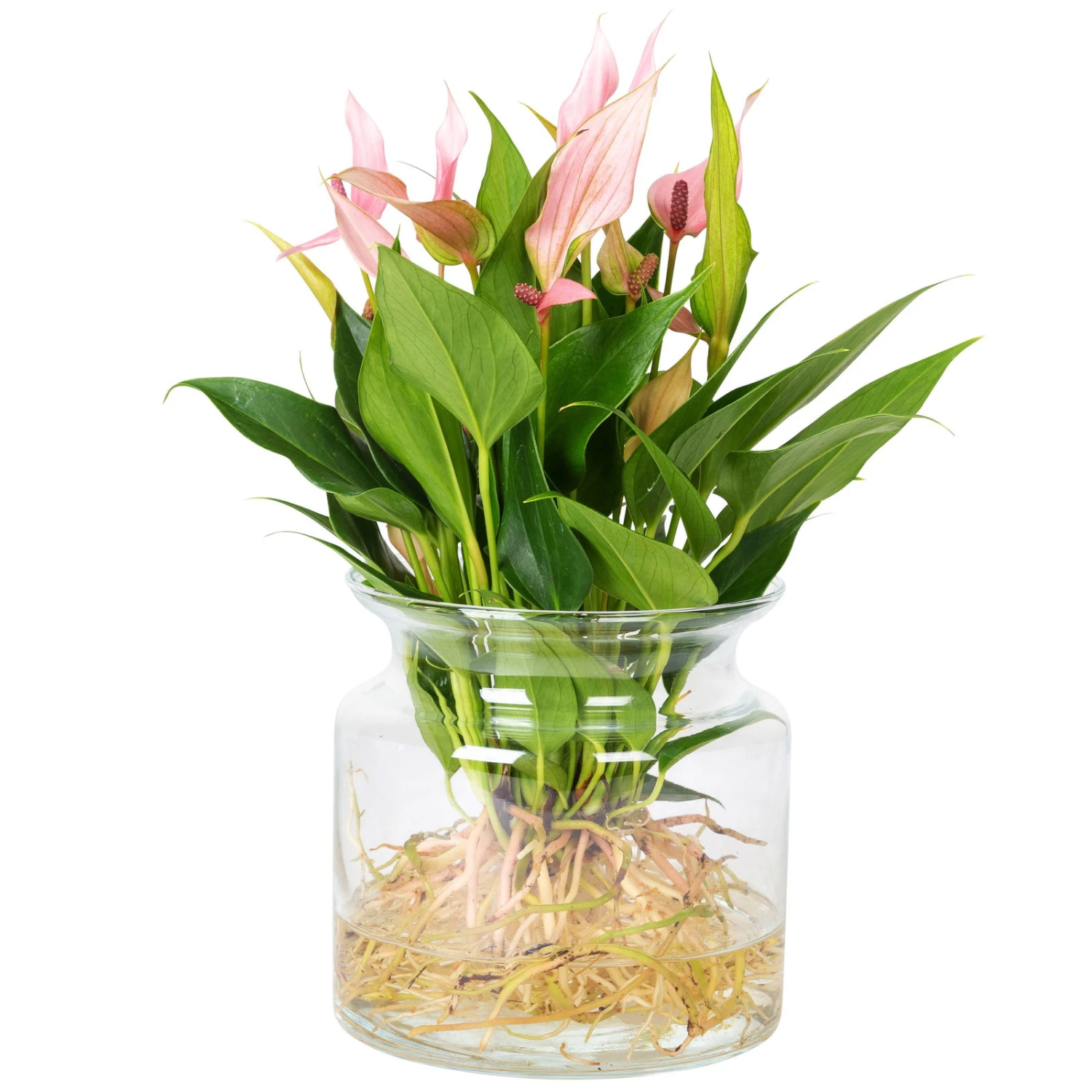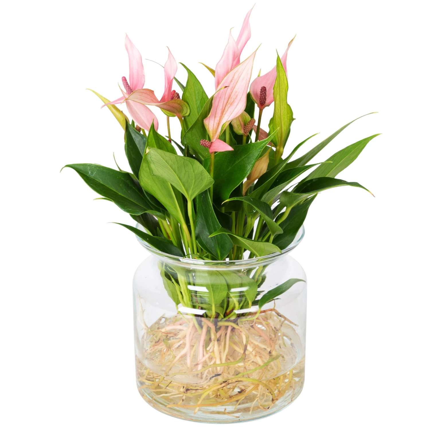 Anthurie ‚Water Roots‘ Rosa, Sorte ‚Lilli‘, In Glasvase 12cm Ø, Ohne Erde