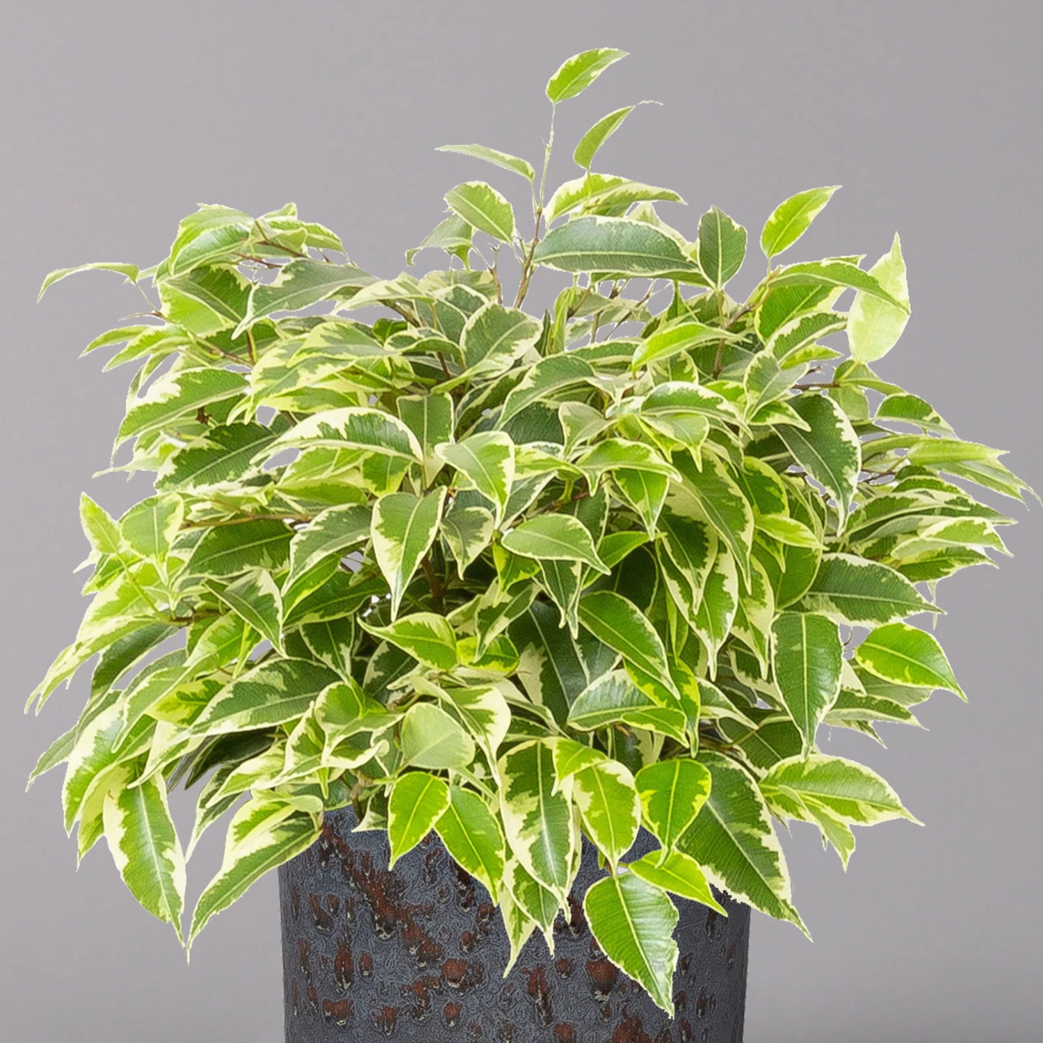 Die Birkenfeige (Ficus benjamina), bei uns auch unter den Namen ‚Benjamini‘ oder einfach nur ‚Ficus‘ bekannt, ist eine klassische Grünpflanze für Zimmer und Büro, die sich seit vielen Jahren großer Beliebtheit erfreut. Charakteristisch sind die elliptischen, zugespitzten Blätter, die je nach Art rein grün oder mit weißer bis gelber Panaschierung versehen sind. Die glänzenden, glatten Blätter sitzen an auffallend dünnen Zweigen, die an den Spitzen leicht überhängen. Die Sorte ‚Kinky‘ kann bei guter Pflege bis zu knapp 1 Meter hoch werden.