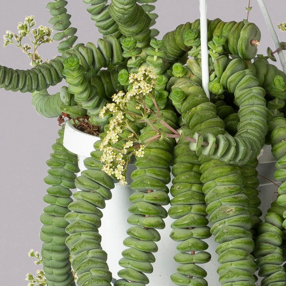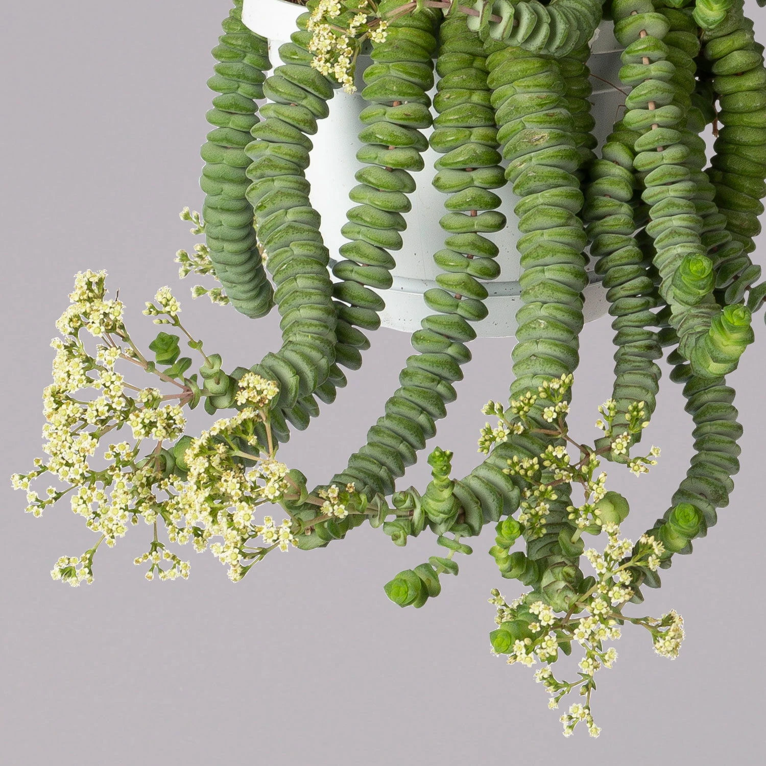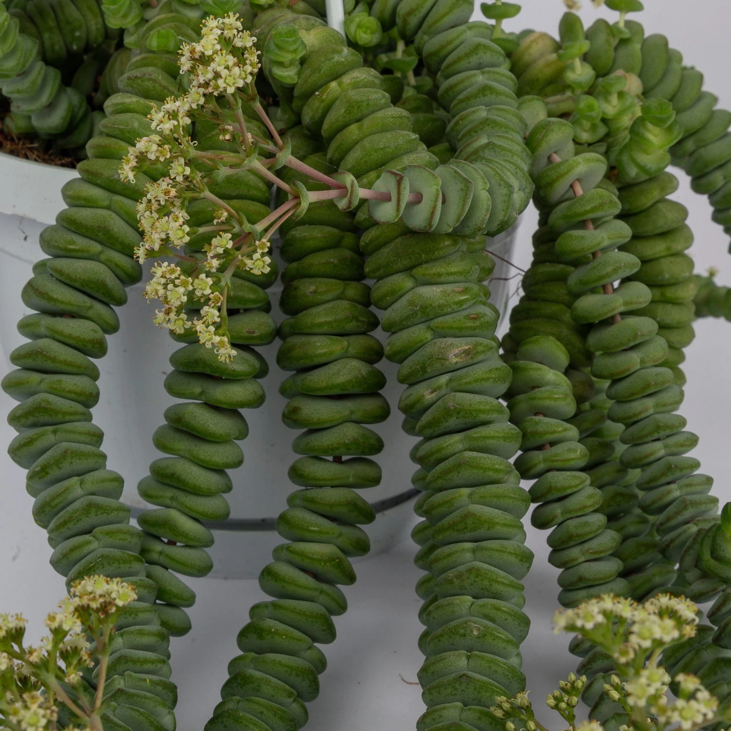 Das Felsen-Dickblatt (Crassula rupestris subsp. marnieriana ‚Hottentot‘) zählt zu der großen Familie der Dickblattgewächse (Crassulaceae), die mit einer Vielzahl an verschiedenen Wuchsformen auftrumpfen kann. Das Felsen-Dickblatt ‚Hottentot‘ ist ein besonders abstrakter Vertreter, das vor allem durch die an eine Perlenschnur erinnernden Blattstrukturen auffällt.