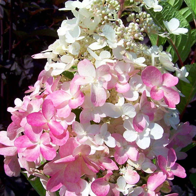 Diese winterharte Rispenhortensie begeistert von Ende Juli bis Oktober mit großen, kegelförmigen Blüten, die anfangs weiß und später intensiv dunkelrosa bis rot sind. Die Blätter der Rispenhortensie ‚Pinky Winky’® sind sommergrün. Der attraktive Farbwechsel der Blüten macht diese Rispenhortensie zu einer äußerst beliebten Gartenpflanze.