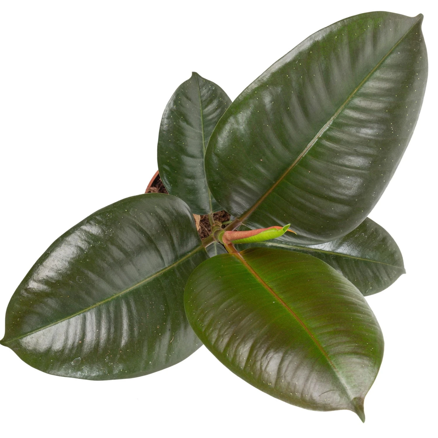 Der Ficus elastica ‚Robusta‘ begeistert mit großen, ledrigen Blättern und gilt als besonders widerstandsfähig. Der anspruchslose Gummibaum, so der deutsche Name dieser Trendpflanze, lässt sich mit gleichem Erfolg zur Begrünung von Büros, Arztpraxen oder Wohnräumen einsetzen. Ein Ficus ist eine richtige Wohlfühlpflanze, da dieses Tropengewächs der Luft unterschiedliche Schadstoffe entzieht und somit für ein besseres Raumklima sorgt. An den Standort stellt der Ficus elastica ‚Robusta‘ keine allzu hohen Ansprüche, denn der Gummibaum gibt sich sowohl mit hellen als auch mit halbschattigen Lagen durchaus zufrieden. Problematisch können neben einem Überfluss an direkter Sonne noch Zugluft und Staunässe sein. Auf Wunsch dürfen Sie Ihren Ficus gerne in der warmen Jahreszeit an einem windgeschützten Standort im Freien pflegen. Bitte beachten Sie, dass der Milchsaft des Gummibaumes giftig ist.