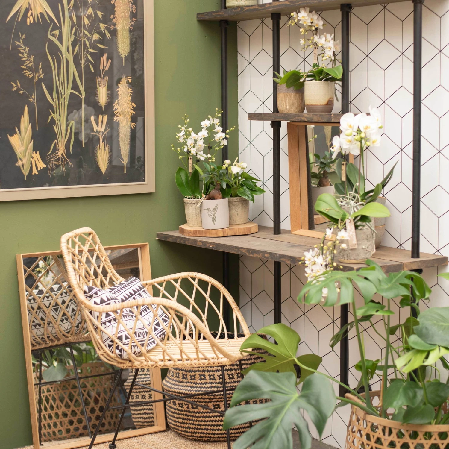 Diese edle Schmetterlingsorchidee besticht mit schneeweißen, formschönen Blüten. Die Phalaenopsis stammt aus den tropischen Regenwäldern Indiens und Australiens, daher ist diese Aufsitzerpflanze auf Wärme und ein feuchtes Milieu angewiesen. Staunässe und Zugluft sind dagegen für die Orchidee schädlich. Damit sich Ihre Schmetterlingsorchidee wohl fühlt, gönnen Sie der Phalaenopsis alle zwei Wochen ein lauwarmes Tauchbad in weichem Wasser sowie eine Portion Orchideendünger. Als Substrat empfiehlt sich eine Mischung als Rindenmulch, Torf und Kokosfasern, die Sie unter dem Namen Orchideenerde kaufen können. Die Schmetterlingsorchidee blüht ausdauernd mehrere Monate am Stück. Eine verblühte Orchidee ist bei 18 Grad zur Ruhe zu stellen, die Rispen sind über dem dritten Auge abzuschneiden.